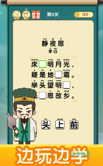 该游戏主要走的是古风路线,游戏里面的谜题涵盖了古诗宋词,大家在进行解密的时候,你会看到谜题对应的一些诗句原文和相关解析,好像跟古人在进行对话,游戏里面的字体以及背景都采用饿了古典设计,配置轻松地古风乐曲,让大家再解密的时候也可以静下心来。