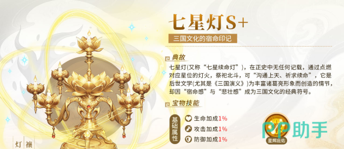 最后介绍的是S+级宝物——七星灯。这件物品承载了浓厚的文化意蕴,常用于祈福延寿、逆天改命之说。佩戴后可提升武将的生命、攻击与防御三项基础属性,并解锁技能“星辉庇佑”。该技能可在战斗中为前排单位恢复生命值,当队友血量低于30%时,立即触发“祈命”机制,回复其10%的最大生命值,显著提升队伍持续作战能力与容错率。