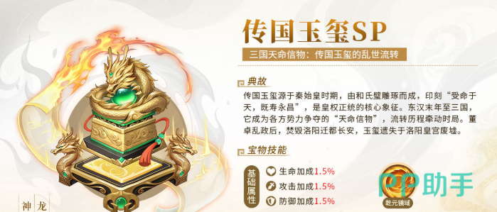 同时随机提升两名己方单位10%的攻击力,兼具爆发输出与团队辅助能力,在推进关卡和PVP对抗中均有出色表现。第二件推荐的是传国玉玺,由和氏璧精雕而成,象征至高皇权。自东汉末年天下大乱以来,此物便成为群雄逐鹿的重要目标。
