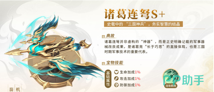 诸葛连弩:作为诸葛亮智慧与军事造诣的象征,这件宝物并非虚构产物,而是基于历史原型改良而成的战略利器。它能为武将提供生命值、攻击力与防御力的全面增益。激活后可发动“连珠箭雨”,对敌方后排单位造成高达200%攻击力的范围伤害;