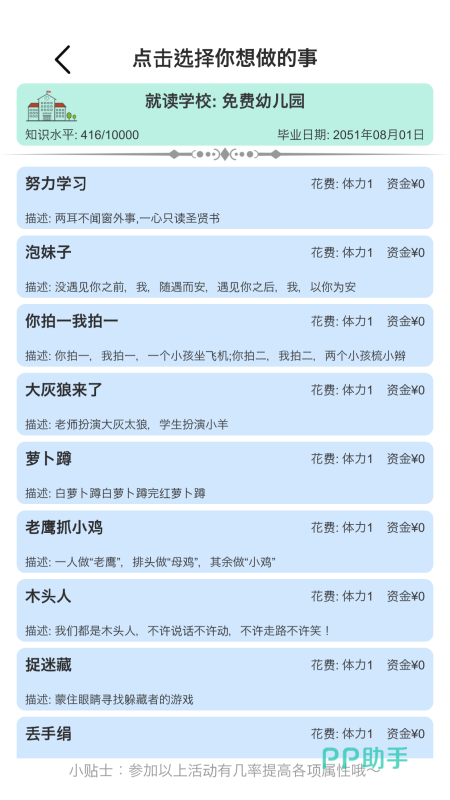 《模拟人生路》游戏在开局中设定了多个出身的选择,比如贫困户、又或者出生在富豪家庭等等,另外包括人物的性格,以及人生中经历的发展事件,游戏全部运用了一种无规律可循的随机设定,通篇更是运用了一目了然的文字叙述,在人生成长的每个年龄段,游戏都会延展出一些那关乎我们命运的关键事件。