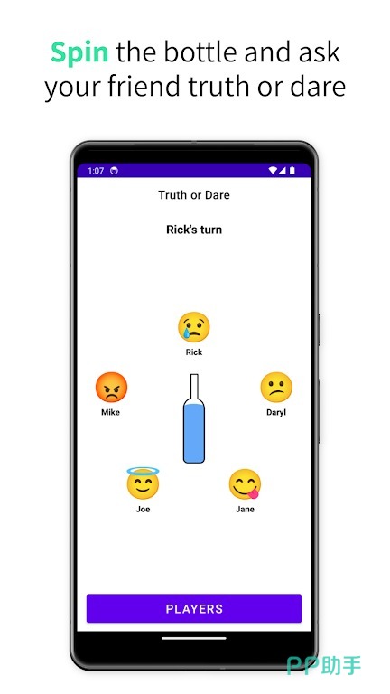 《真心话大冒险 Truth or Dare》还原经典瓶身旋转机制,指向谁即由谁作答,保留传统玩法的同时加入现代化功能。支持中英文切换,满足不同语言用户需求;内置计时器提升紧张感,未在规定时间内作答将触发惩罚机制。此外,提供跳过选项,尊重个人边界,兼顾游戏节奏与用户体验。