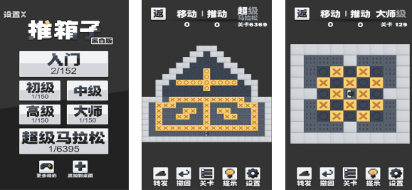 这是一款采用经典黑白画风的益智类推箱子游戏,规则简单却极具挑战性。玩家需要将所有箱子精准推入目标位置才能通关,关卡从易到难逐步递进。游戏内置多种模式,包括大师赛与马拉松挑战,增强了解谜过程的可玩性和耐玩度。整体运行轻快,无需复杂操作,非常适合喜欢动脑解谜的用户。