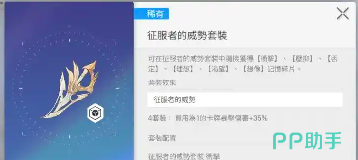 第一种武器装备搭配思路,非常适合于暴击输出流,对于手中有梅林、雷欧娜、卢克等依赖暴击输出型的卡牌角色,可尝试选择这一流派,需要使用到的装备包括征服者示威4件套+执行者的道具2件套,这一搭配的具体思路是利用征服者的示威,来对暴击率进行整体提高,而执行者的道具,则可以强化暴击后的伤害数值,当两者强强联合时,则可以对角色的爆发属性进行高效提升。