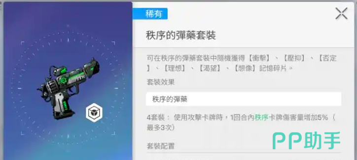 第三种搭配思路是攻击强化流,选择制取的弹药四件套和黑翼两件套,这一套装与雨果的适配度很高,也可以尝试在一些高频攻击的基础卡牌角色身上使用,其中秩序的弹药可对基础卡还进行专门强化,而黑翼则可对攻击力进行提升,每一次的普攻也能够达到非常不错的效果,对于早期将获得雨果的卡牌的玩家来说,可尝试。
