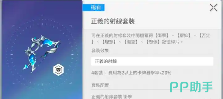 第二种高费技能爆发流,比较适配的角色有百丽儿、小春等部分核心技能为2点的角色,核心的搭配方案为正义的射线四件套+执行者的道具两件套,其中正义的射线可对两费卡的伤害进行大幅提升,可谓是这一类角色的必选,而搭配执行者的道具,则可对暴击伤害完成更高放大。