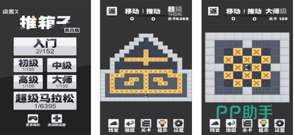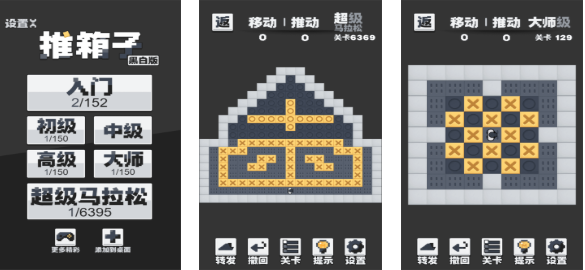 推箱子黑白版是很多推箱子粉丝喜欢玩的经典闯关类游戏,休闲闯关的理念齐备也有着大量推箱子模式,轻松简单的上手机制帮助玩家卸下满身的压力,游戏采用很简单的控制体系就可推箱子进行闯关,最困难的马拉松模式也考验着玩家推箱子的技术,提示功能全面可快速让玩家与木箱进行互动解谜。