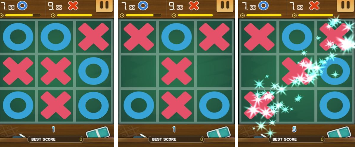 每个井字棋冠军都可以进入这款双人对战游戏比拼一下,总有比你还要强大的下棋高手会在游戏中出现,同时游戏还加入了人机对战练习模式让玩家快速感受下棋乐趣,井字棋的对战理念在国内并不常见,很稀奇的博弈机制跟红蓝色调的配色辨识度更高,点触方格中心放置XO的棋子即可进行博弈,同时游戏对战设定方面很完善也很公平。
