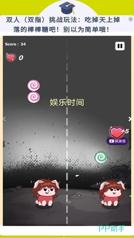 采用创新分屏技术实现双人同屏操作,玩家将分别操控俏皮的小动物角色,在同一画面下展开合作或竞争。主要目标是收集散落各处的糖果与棒棒糖,比拼收集速度与数量。每一关卡均配有节奏明快的背景音乐,增强沉浸感,同时鼓励情侣同步行动,提升互动体验。