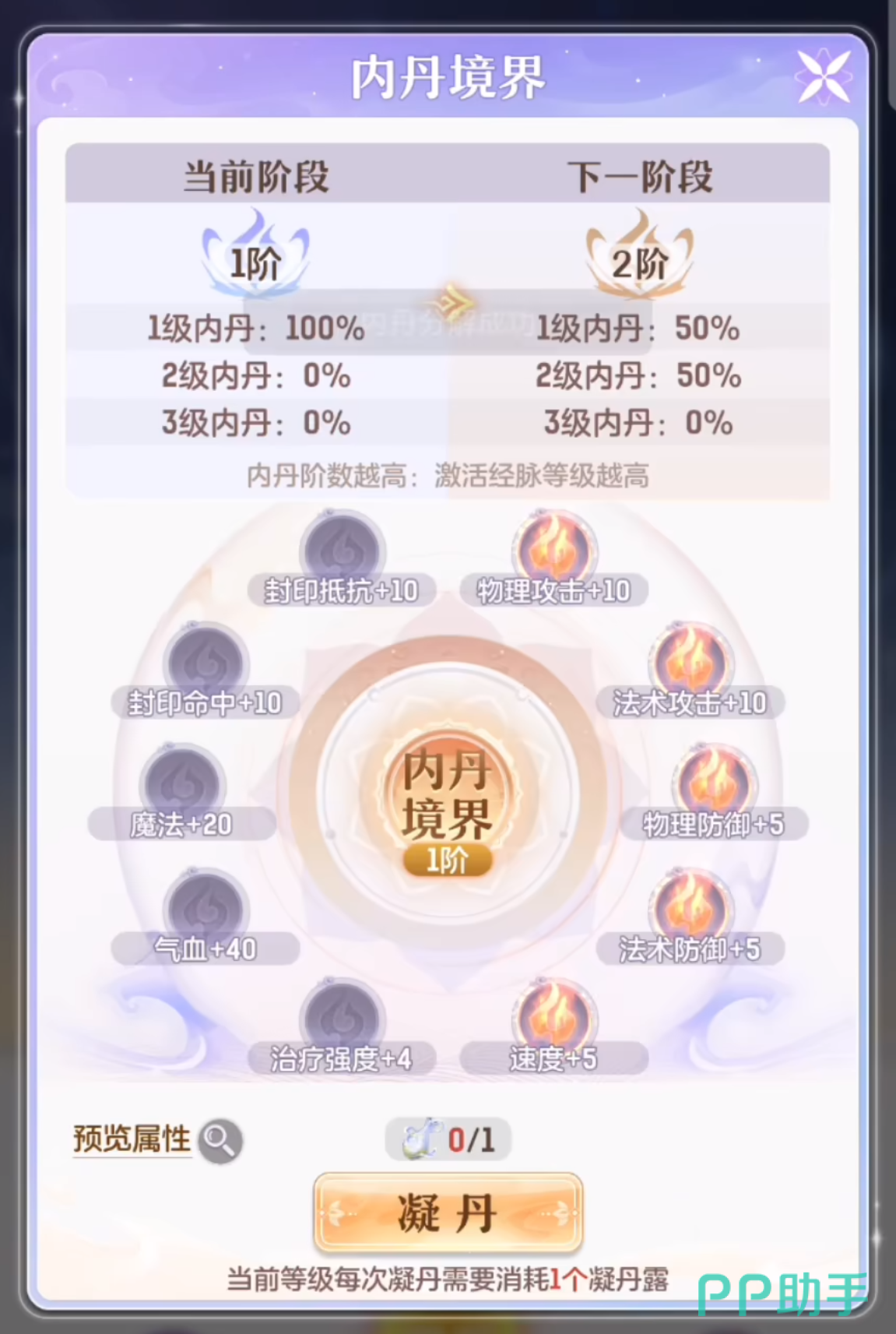 2、消耗特定材料提升内丹境界。其中最重要的资源是【凝丹露】,该道具用于突破内丹的当前境界层级。然而,凝丹露获取难度较高,主要依赖副本挑战中的随机掉落,且掉率偏低,属于稀缺型养成材料。