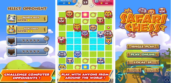 清新又可爱的画风,支持多种不同的模式,分别是人机对战以及双人对弈等等,您可以和自己的好兄弟一起加入,在开局之后,双方会有8种不同动物组合而成的棋子。排行首位的就是大象,而排行最底端的就是老鼠,这些棋子,将生物链展现的淋漓尽致,而大家却需要正确放置的方式控制率先出场的动物,经过几回合之后,将对方的动物棋子全部吃掉。