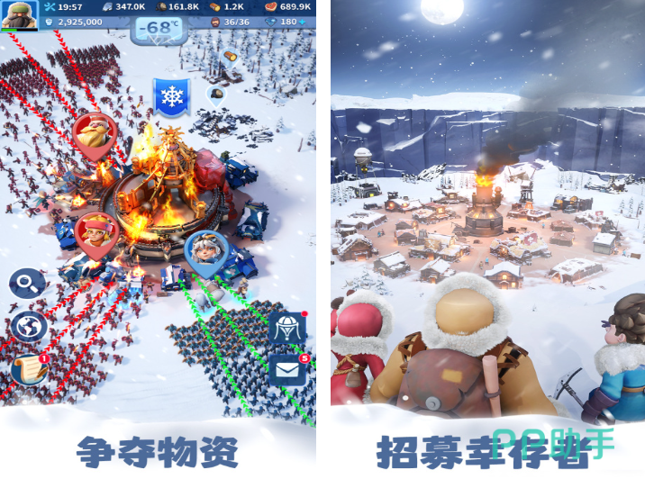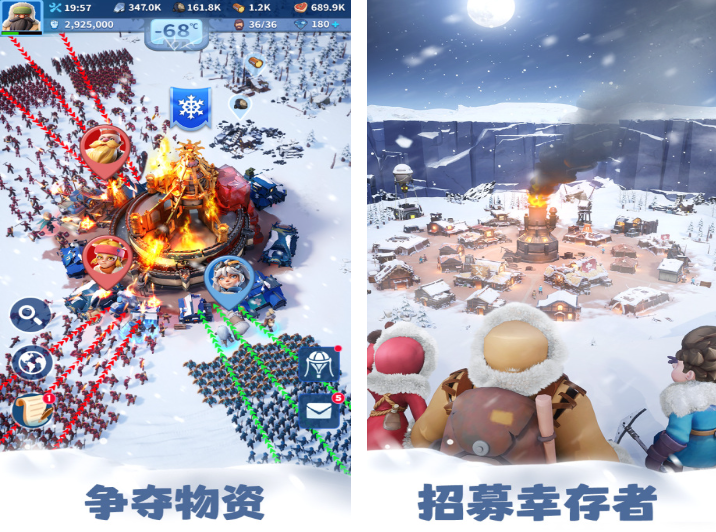 这是一款放置玩法的策略游戏,玩家们需要在严寒的世界中建立自己的避难所,并将其逐渐升级扩大。游戏完全不需要操作技巧,只需要手指点击就能够游玩,等避难所升级到一定程度之后,就能够开启征战模式,玩家们可以向其余的镇长发起对决,避难所的等级规模和所招募幸存者的战力决定了胜利的天平,不过还需要玩家们的指挥来决定战斗的走向。同时,这款游戏还支持实时pk,也可以和自己的好友组队作战。