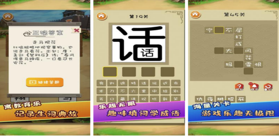各种趣味性十足的玩法巧妙结合,组合成创新式的猜成语游戏,比如有的是以一幅画为主,有的是以成语接龙为主。大家在闯关时都可需要冥思苦想,认真挑选正确的汉字填入进去,只要回答正确之后就会看到成语的具体解释,还有由来等等。既能放松心情,又能加深孩子们对于成语的理解和认知。