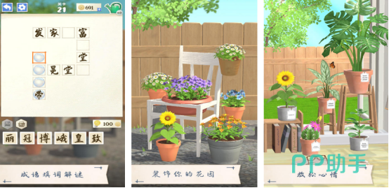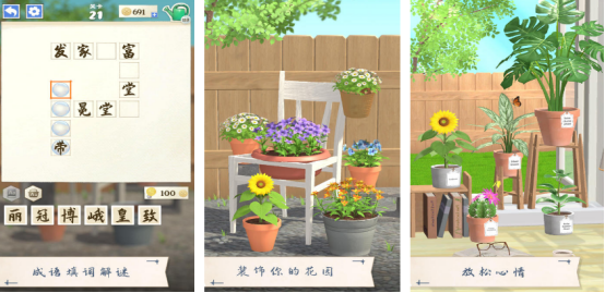 建设花园以及成语知识巧妙碰撞,讲述的就是其中的主角厌烦了大城市的枯燥生活,因此想回到自己的农村老家过着特别安逸的生活。当回到自己家中时,就愿意通过种植各种美丽花卉的方式,让自己的花园变得非常美丽,其中的成语知识应有尽有,所有的关卡都是以成语接龙的方式所展现,大家在成功完成挑战之后,就可解锁各种漂亮的花卉来装饰自己的花园。