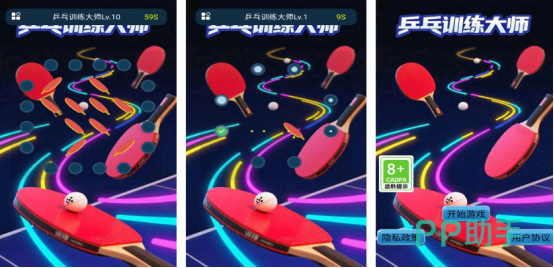 围绕着打乒乓球的规则所设计,在开局之后并不是只有两个球拍,反而眼前摆放着很多球拍,大家在每次挑战乒乓球比赛的时候,要精准确定球落的位置或者球的运动轨迹,正确点击球拍即可成功接到球。