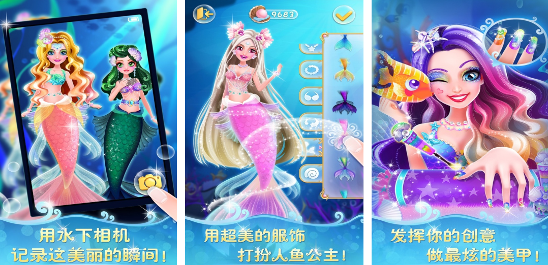 这款游戏的主角和其他几款游戏有些不同,玩家们需要装扮的是人鱼族的小公主。其实主要的玩法和其他几款游戏并没有太大区别,可是它的特色在于“人鱼”,玩家们除了给小公主选择绚丽的上衣之外,还需要搭配不同造型但都十分精美的鱼尾巴。而且妆容的设计也带有更多的海洋元素,玩家可以将大小各异的珍珠、色彩不同的小贝壳和珊瑚点缀在公主的妆容上,最后还可以去海底的各色景观处打卡拍照。