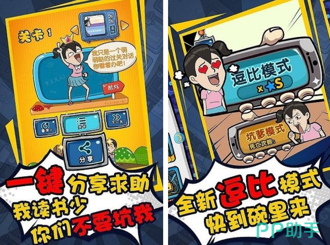这是一款无厘头的搞笑解密类游戏,也是有着很多种不同的关卡,都会给出通关要求或是通关提示,不过小编提醒最好不要用正常的脑回路去思考,有的时候从多个方面去想反倒更有可能通关。而且游戏内时不时还会蹦出一些好笑的段子、好玩的图画,整体的游戏氛围都很轻松,而且玩家如果想不出通关方法的话还可以去求助其他玩家,一同进行头脑风暴。