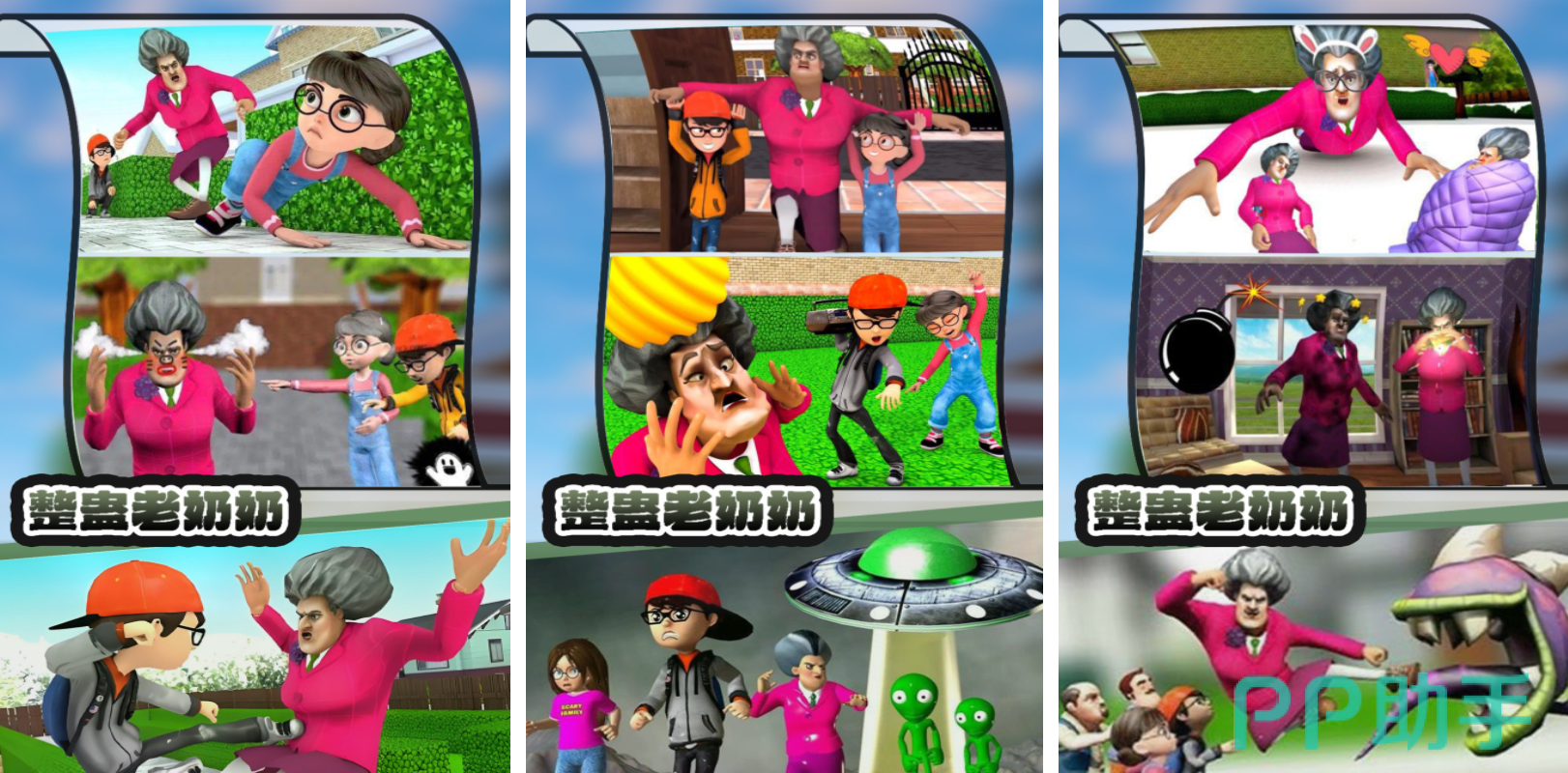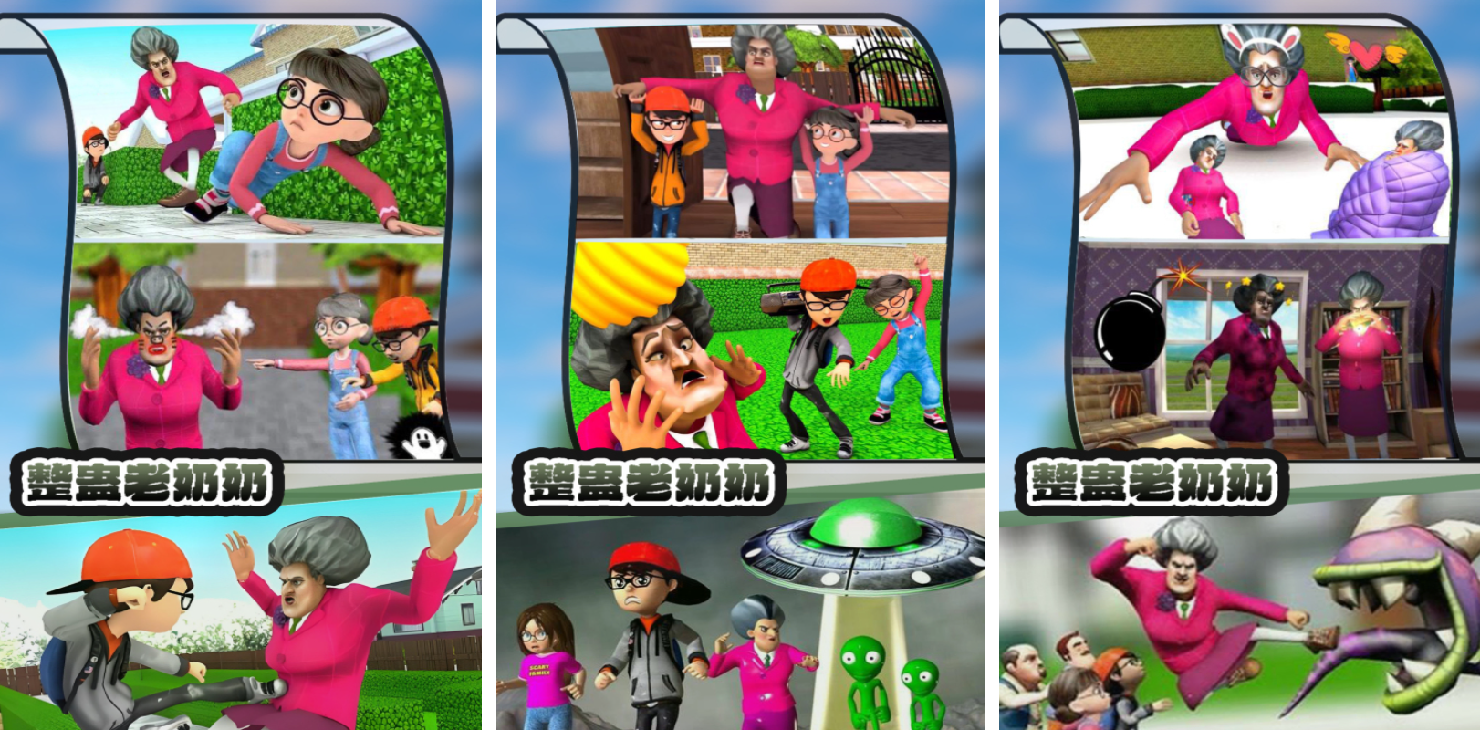 这是一款放松类型的闯关游戏,玩家们将和自己的好朋友一起整蛊老奶奶,不过在整蛊的途中也需要小心老奶奶的反抗。这款游戏是那种3D动漫的画风,不管是老奶奶还是小孩子看起来都非常好玩,而且有的时候老奶奶被整蛊到就会来一个飞踢,还会一手提起一个小朋友,所以不管是整蛊成功还是失败它的动画画面都是很好玩的。