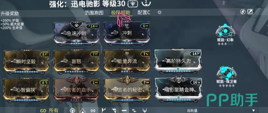 若追求极致的奔跑速度体验,则可对MOD进行进一步优化调整。进阶配卡推荐如下:急速冲刺、冲刺、瞬时坚毅、盲怒、能量奔流、高阶持久力、心智偏狭、预言者的启示、预言者的秘密、暗影聚精会神。赋能推荐使用幻象与保卫者,此套配置能显著提升加速效率与技能释放频率,实现更流畅的连续滑行与空中衔接动作。