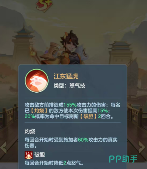 其怒气技“江东猛虎”为范围性前排打击技能,基础伤害高达155%攻击力,每当命中一个正处于灼烧状态的敌人,该技能伤害再提升15%,极大增强了群体爆发力。此外,该技能还有20%概率附加“破胆”效果,持续2回合,使目标在每回合开始时减少2点怒气,有效压制对手释放大招的节奏。