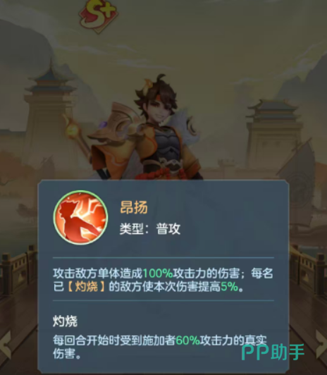 孙策的基础普攻名为“昂扬”,可对单一敌人造成等同于自身攻击力100%的伤害,且每有一名敌方单位处于灼烧状态时,本次攻击伤害额外提升5%,这使得他在面对多灼烧目标时具备更高的输出潜力。