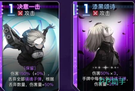 第二张卡依据当前手牌中持有的子弹类卡牌数量进行增伤,每拥有一张即可提高50%伤害,鼓励构建以子弹为核心的卡组结构。第三张卡具备180%的基础伤害,并且每丢弃一张子弹卡可额外增加100%伤害,单次释放潜力巨大。最后一张卡则专注于弃牌机制,通过主动舍弃手牌来触发后续联动效果。