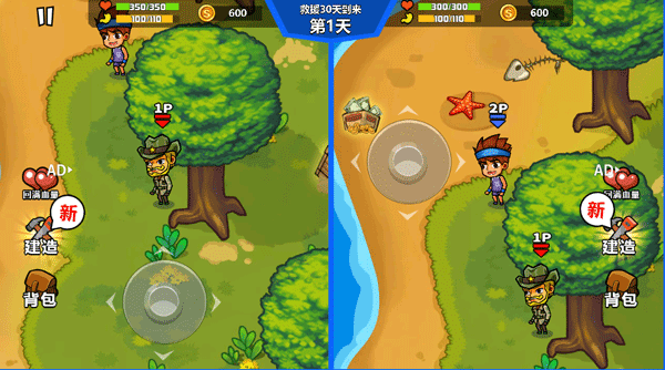 借助分屏技术,《双人海岛求生》实现了真正意义上的独立行动与协同生存。两人在同一岛屿探索,各自承担采集资源、建造设施、抵御自然灾害等任务。写实与卡通融合的画面风格营造出独特的荒岛意境,必须依靠紧密配合才能完成复杂挑战,极大增强了互动感与沉浸感。