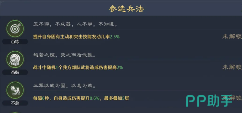 其中百炼带来的提升,固有主动以及突击技能效果的话,带来发动概率都有2.5%左右的提升,而奋鼓这个兵法,其实很多玩家都是听说过的,因为奋鼓目前在阵容搭配里面经常常见它带来的兵法效果,可以给一个随机的我方武将带来伤害提升2%,这样的一个数据效果放在目前搭配的情况上面,他们使用的武将还是比较多的。最后就是励军派系的一个兵法效果,在这里的话,基本情况下是给一些辅助类型的角色使用,比如说曹操、大乔、华佗或者是貂蝉这类武将基本使用的都是励军派系当中出现的兵法效果,在这里基础带来的都是一些辅助能力的提升百分比在这里。