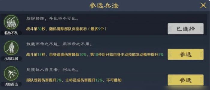 而军略派系的战法,其实在其中基本都是根据每个武将他自身的主动战法技能来提升输出效果的,在这里的话推荐的情况下一般是给关羽、吕布、诸葛亮这类武将来进行搭配,此类军略派系的战法,当中比较出名的有临危不乱,示敌以弱、诱敌而击,此类战法效果目前带来的百分比都是施加在一些战斗效果当中的,而且其中的概率提升百分比都是比较高的,其次第三类派系就是刚毅类型的兵法效果,这里如果大家要使用此类兵法给武将进行搭配的话,最好是给一些带有坦克类型效果的武将进行,比如说曹仁、程普、高顺之类武将,其实自身都是有一些坦克武将使用的技能效果,那么此时给他们选用兵法的话,刚毅派系的兵法里面带来的能力就非常不错,比如说百炼、奋鼓、不息这类兵法他们带来的提升都是此类能力。