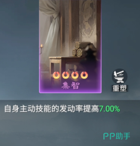 接下来为大家推荐的是集智这个技能卡,在游戏当中,通过这个技能卡可以给武将发动自己主动技能的时候带来更多的成功概率,只要能够发动技能,其中一些额外效果的触发百分比都会在发动概率上面有7%的数值提升,可能部分玩家会以为这样的百分比数值不高,但是这是基于本身主动技能百分比已经很高的情况下用,所以针对一些本身自己主动技能就比较好用的玩家来说,这样的效果就是比较有加强意义的。