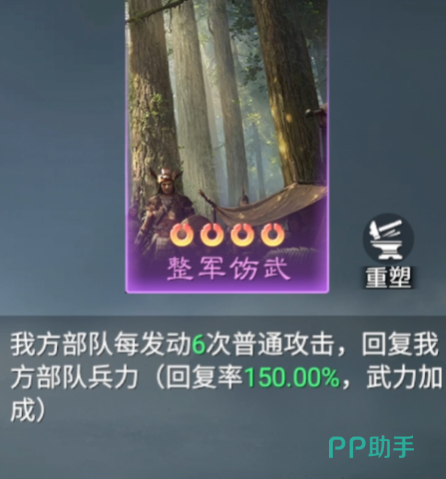 第二个是为大家推荐一个整军伤武技能卡,这个技能卡当前效果当中可以为我方的部队带来没发动6次普攻后可以触发的一个效果,只要达到这样的次数之后,大家在上面就可以为我方的武将带来部分兵力的恢复,而且在上面还可以带来兵力数值上面有150%的回复率,所以在武力加成效果上面还是非常明显的。