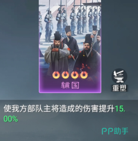 辅国这个技能卡其实放在前期很多玩家还不太会用,因为带来的加成效果比较简单,但是其实只要大家在上面能够找到适配的武将,这个技能的战力加成是非常厉害的,在其中大家可以根据技能卡的效果来给我方主将的效果增加15%左右的伤害提升能力,所以这个技能卡其实在搭配一些输出类型主将的时候效果最好,如果是智谋类型的武将这里可能提升的效果反而没有那么好,那么针对这里带来的百分比提升自然会让强势的队伍更加强势。