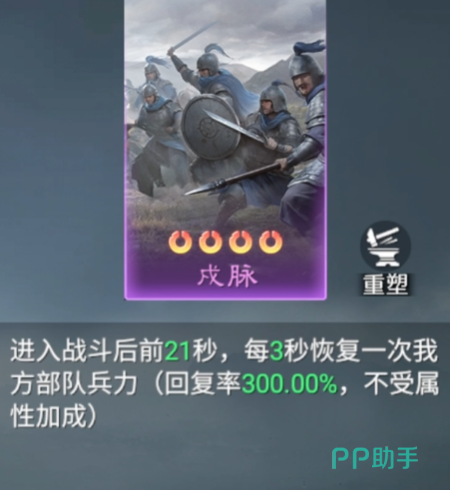 戌脉这个技能卡本身品质还可以的同时其实很多玩家都是用过的,因为可以给大家带来一定的兵力恢复效果,但是这里是只有在进入战斗时间㘝21秒结束之后这个技能就很难再给大家带来恢复了,这里触发技能之后每3秒的时间之内都会为我方的武将带来部队兵力数值达到300%的回复效果,且此时子啊兵力恢复效果上面不回受到属性效果的加成,所以回复效果不错,但是没有额外的加成效果叠加。