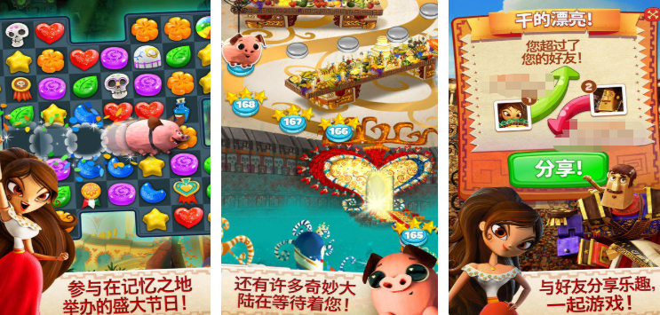 游戏里边有很多不同的糖果进行排列,需要将相同造型或者颜色相同的糖果搭配组合,就能够触发消除效果,后期还会解锁各种障碍物,需要在消除的过程中躲避障碍物的阻碍,有些高难度的关卡还会限定步数,只有在要求的条件下完成消除才可以获得关卡的胜利,道具需要通过通关关卡来获取,利用道具就可以快速的通关。
