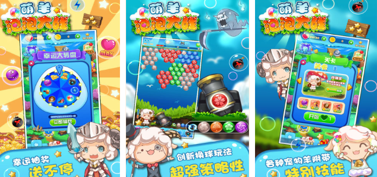 游戏融入了萌系的角色,可以体验到色彩艳丽的视觉效果,玩家可以将泡泡发射到上方来攻击泡泡,三个及以上同颜色的泡泡相连就会消除,还有各种特色战斗模式可以挑战,救羊模式需要在限定的射击次数中解救目标,无尽模式就非常考验玩家的消除能力,积累分数就可以兑换一些道具。