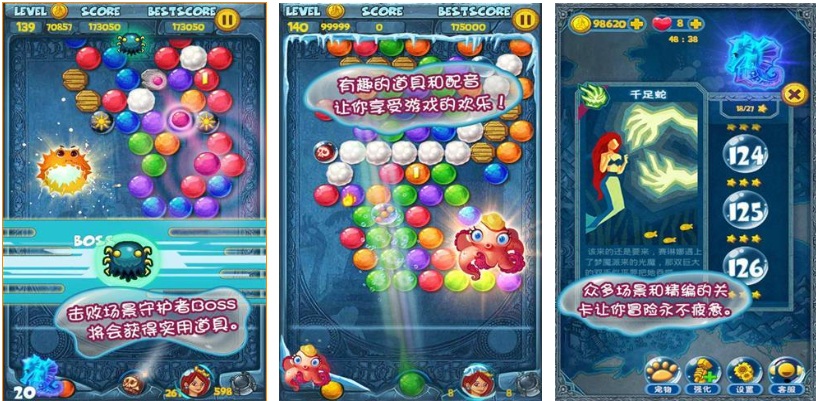泡泡龙系列游戏爱好者可以进入神秘的亚特兰蒂斯冒险,这是款内容设定在深海之中的免费单机泡泡龙手游,众多的游戏场景、鲜艳明亮的美术可玩性更高,精致美观的美术表现带来的娱乐性自然不差,有趣的各类道具辅助会帮助玩家快速消除泡泡,灵动的视听展现配以灵活操作更是玩家最爱,你也进入亚特兰蒂斯的世界完成泡泡龙关吧。