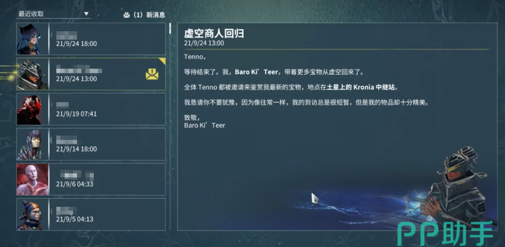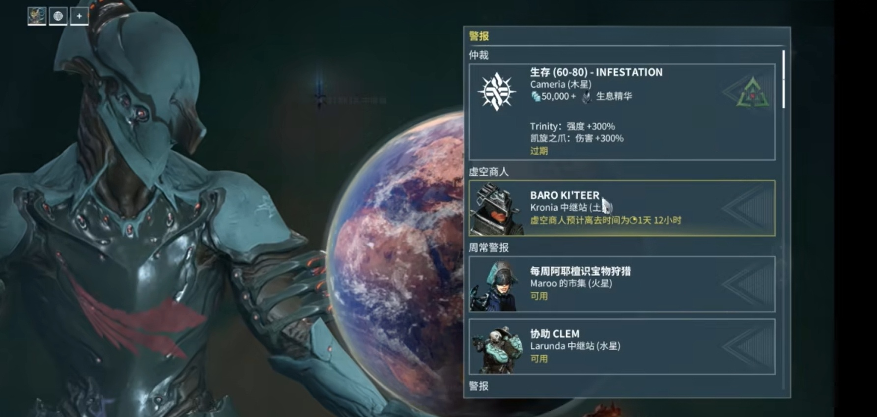 另外还可以通过以下几种方式快速找到虚空商人,首先是虚空商人到来之前,游戏就会发邮件通知到达时间以及所在中继站的名字,在邮件里有时候也会有直接传送的链接可以一键直达,其次就是在打开游戏的大地图之后,在各个中继站中央广场的位置会有一个明显的虚空商人图标出现他的位置,跟着导航就能到。最后就是查看游戏内的警报信息列表里边也有虚空商人的出现地点,不会让玩家错过他。