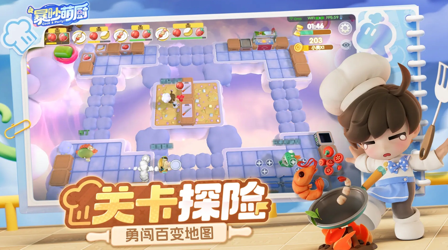 以热闹厨房为主题的多人协作与对抗玩法是本作的核心亮点。玩家可以在游戏中扮演厨师角色,与伴侣一同完成上菜任务,也可分队比拼哪一组服务的顾客更多。游戏强调实时互动,包含丰富的动作反馈和场景交互元素,非常适合追求趣味联动的情侣玩家。关卡内设有多种机关装置,既可能带来挑战,也能被巧妙利用来加快出餐效率。