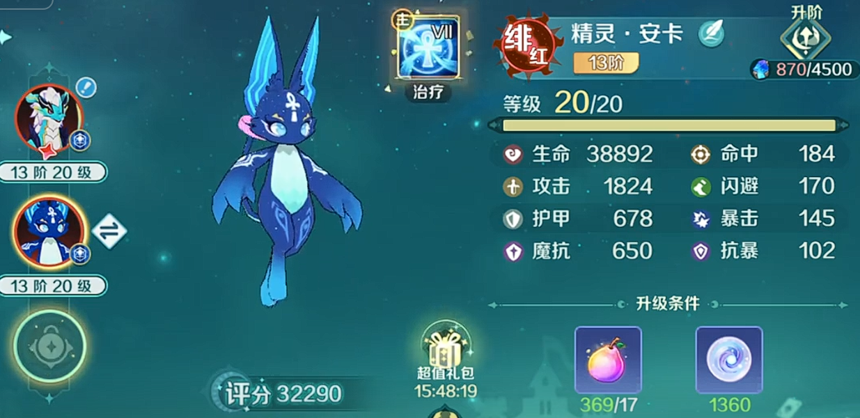 比如说如果大家带的是其中雷威电龙,就是一个控制效果,以及这个安卡,可以负责角色的一个治疗回血不对,那就是说还可以去养什么呢?就是一开始给的这个喵灵库姆,喵灵库姆的话是非常适合输出职业的,可以去减少角色8%的一个防御,以及就是说再搭配上战神创击,直接给大家带来一个2.6秒的无敌状态,这个2.6秒无敌状态,升到绯红是2.8秒,可以看一下往后面升的越高,它给大家持续的时间就越长,控制在这里就不敌了,所以这个其实就相当于是奥黛丽有很多人现在都不知道,这两个是可以去用的。