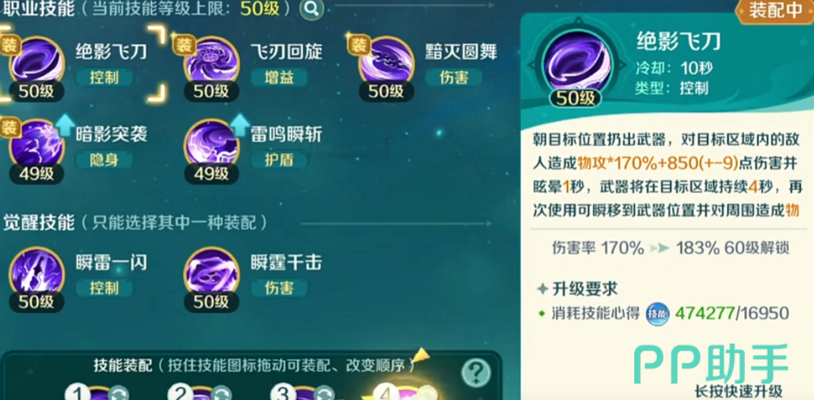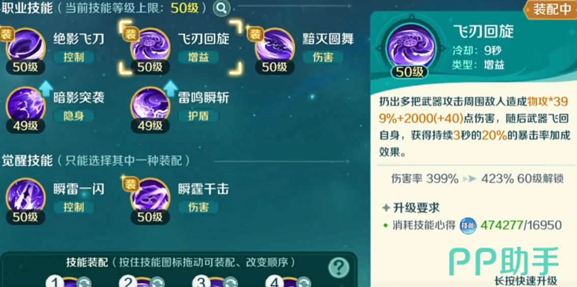 而且在流派当中其实大家要注意他的绝影飞刀技能,一般是跟绝影飞刀一起搭配的,这类技能都是可以搭配在一起的,因为这是目前相对于整体的技能搭配来说一个非常经典的搭配,目前依靠这样的机制,其实在游戏当中就可以利用瞬霆千击技能,释放了输出之后达到一个3秒的暴击率加成,基础带来的暴击率加成也会有20%的概率,而且加上黯灭圆舞这个技能,如果这一次的伤害产生了暴击的话,那么他后期在持续的3秒时间之内还是有机会可以再一次使用输出技能的,所以相对于幻刺技能通过触发的伤害来说,这个技能带来的一个加成效果非常重点。