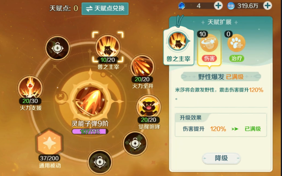 天赋加点的话,来看一下PVE的搭配当中是优先把这个火力全开全部点满,点满之后再去点个兽之主宰,然后带治疗的话,有奶妈的话可以不点,如果是没有奶妈的话,那可以降直接去加通用被动里面的一个枪火之力,提升攻击力,那么觉醒咆哮的话呢,这边依然是全部点满,然后再点火力支援,火力支援的话两个伤害点满,然后减速的话这边就是可点可不点,大家想要参与团战的话,基本参与PVP的话用上面技能搭配没什么好说的,优先把野性链接这个核心点起来,包括其中的单体效果那一套也是一样的,把其中核心的野性链接、治疗免控全部点完。