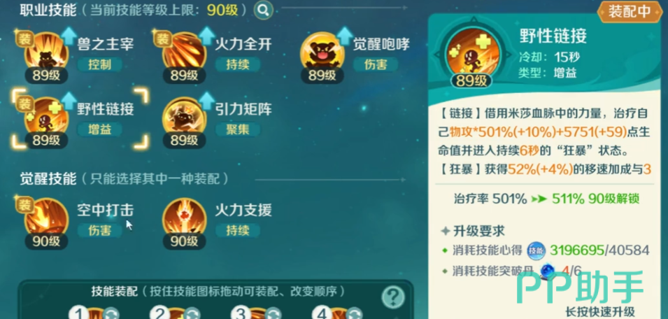 这里给猎魔人玩家带来的第一套是一个打副本PVE的加点,带的是一个兽之主宰,然后火力全开、觉醒咆哮,最后再带一个火力支援,那么这个是适合日常挂机之类的玩法,然后如果喜欢喜欢爬塔,或者是单挑的时候呢,可以用第二套单体的技能加点,单体的话就是把觉醒咆哮换成了一个野性链接,因为这个野性链接呢,大家可以看到的,它是有一个治疗吸血的加成,所以说对于在单体副本中可以给自己的是非常不错的续航能力,有这类能力的话针对PVE里面提供的副本大家可以用到的实力更高。