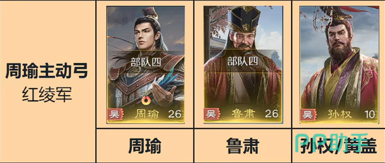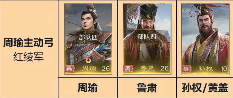 孙权在上面搭配了周瑜、鲁肃之后这个阵容就成型了,或者是搭配黄盖也行,这里周瑜的机制,就是给全体造成主动技能的时候会有一堆的伤害和燃烧,而鲁肃有一个比较高概率的主动技能,并且能使主将的谋略伤害提升,这个特别好用,并且增加统帅和智力就能让这个周瑜伤害打的更高,那孙权他的收益就是百搭的,孙权在吴国只要是兵种适配,都能用,就非常百搭,他的机制就是是全队的这个统帅、武力、智力都能提升50点了,所以这三个人组合就是一个很好的体系,但是孙权也比较难抽,所以大家也可以选择用这个黄盖,但是如果用黄盖的话,这里就只能走这个盾兵搭配了,如果用孙权就是走弓兵,黄盖会对自己的部队造成一个武力伤害,但是黄盖这个技能的伤害系数仔细一算的话,他对敌方造成的伤害系数是一个400的伤害系数,所以说,没有孙权就无脑上黄盖,也是很好用的一个组合。