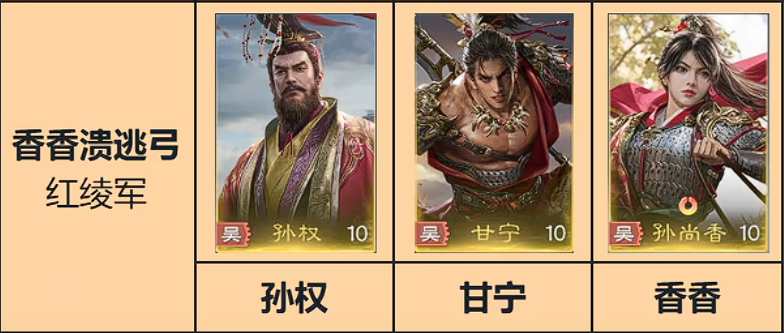 最后是以孙尚香为核心的溃逃弓的流派啊,首先是孙尚香提供双S的这个猛攻,系数最高能叠到50%乘以9次,并且若对方处于溃逃状态,则有概率无视防御,450的一个收益,并且有概率防御,那这个就是孙尚香的效果,但是要打满也不是那么容易,但是孙尚香不适合当主将,技能没那么厉害,所以孙尚香用的话是当副将,当主将很一般,孙尚香比较适合搭配的就是甘宁,甘宁的正常提升伤害,并且每个主动技能都会直接附加溃逃,两个主动技能基本上每回合都会附加溃逃的,所以说这个情况下,那个孙尚香就可以稳稳打出伤害,然后这个正面状态怎么来呢?其实除了各种技能之外,孙权也是可以给自己叠3种属性的,如果没有孙权的时候,就再上个别的东西也可以。