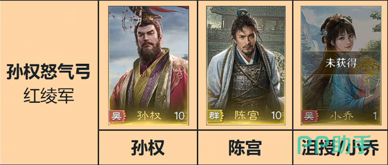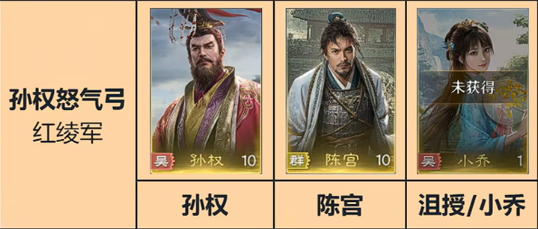 那接着第二套,就是孙权怒气弓,孙权+陈宫+沮授,或者上小乔也行,孙权的这个主动就是一个百搭的主动效果,也有比较不错的大招技能,一般造成的谋略伤害系数大概像吕布的话是1200左右,就是人多才到1800,那算全这个技能直接是2500,然后还带一个驱散负面状态,这都特别的强,所以孙权的怒气技能就是全游戏最强的,如果孙权红度提到了五红,一红和三红都是辅助,都是让孙权的辅助技能变强,但是拉到武红的话,主将伤害加30%,从2750再加30%,且主将命中3个以上目标时,自身怒气加100,满红孙权真就是炮塔,而如果需要用孙权呢,这里就会有一个满红小乔出现了,小乔是每秒3点怒气,并且每秒有一个受到伤害降低只是3秒,就这个减伤效果很一般,大概只有一个7%的减少效果,然后每两回后其实收益也不高,但是小乔进阶也有一个很不错地方,首先是一红的伤害降低无所谓,但是三红就变态了,每秒恢复5点怒气,这时候就有点东西了。
