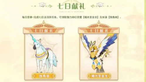 游戏登录之后还会有千抽的福利。角色在达到35级之后,并且完成主线任务,每一天都可以获取命运之羽,累计就可以获得1000抽。一旦有了这一些召唤道具之后,那自然就可以轻松的抽取到使魔。不管是输出型的伙伴,还是控制性的伙伴,全部都可以收入囊中,让你的童话冒险之旅,可以一路的开挂,在体验游戏时就没有什么太大的压力。游戏的奖励还是很丰富的,例如还有7日献礼。在活动期间,每天登录游戏,并且完成7日谈活跃任务,就可以免费领取曦光圣金龙,还有独角兽。颜值看上去很出色,并且还有顶尖的实力,确实会成为全场的焦点。