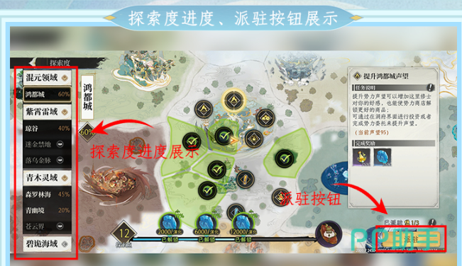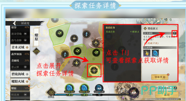 打开地图之后,把视觉拉到最大,就能看到每一个区域的探索进度。在地图的左下角,还可以点击探索图标,能查看所有探索的信息以及任务的要求。左下角的派驻按钮不要忽略,可以派好友或者妖兽去驻扎,能迅速的提升这个区域的探索收益。左侧界面还会显示所有地区的完成进度,中下区域可以看到收益的进度,中间则是详细的任务列表。探索点越高,那后续所能获得的资源也就更加的丰富,记得要及时去领取奖励。