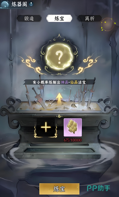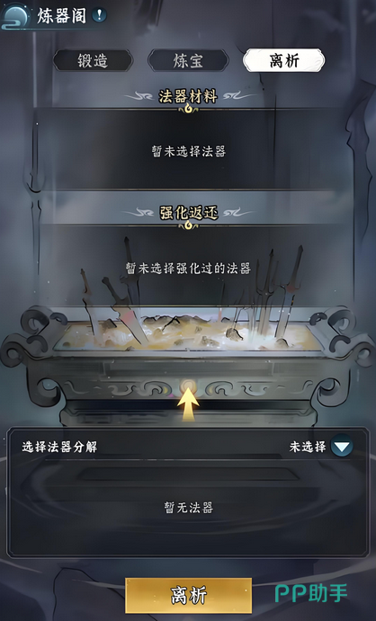 除了锻造之外,炼宝系统也是提升战力的重要途径,但所需材料较为稀有,前期不建议过度投入。初期可简单炼制几件过渡使用,若灵石充裕可适度升级,但切忌沉迷其中造成资源浪费。此外,炼器阁内还有一个常被忽视的功能——离析。此功能可用于分解闲置或低品质的法器,回收后可获得一定数量的强化素材,有效缓解背包压力的同时还能补充培养资源,所有无用装备都应统一处理。