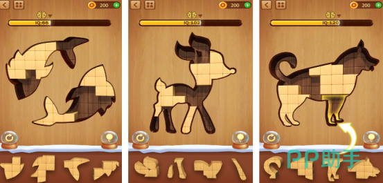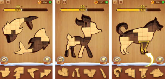 不同于传统拼图类游戏,本作采用立体画风展现趣味图案,如狼、鲨鱼等可爱动物形象。底部提供若干几何形状的方块,玩家通过拖动操作将其放置到正确区域完成拼合。操作简单但富有逻辑性,每完成一幅图案还可解锁新图鉴,激发孩子的成就感和持续探索欲。