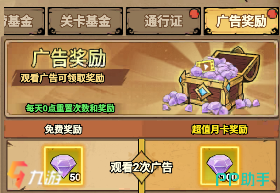 广告激励:每日观看广告即可领取钻石,操作简单、门槛极低。完成10次广告播放可领取500钻石;已购买月卡的用户还可额外获得1000钻石,合计单日最高可达1500钻石。